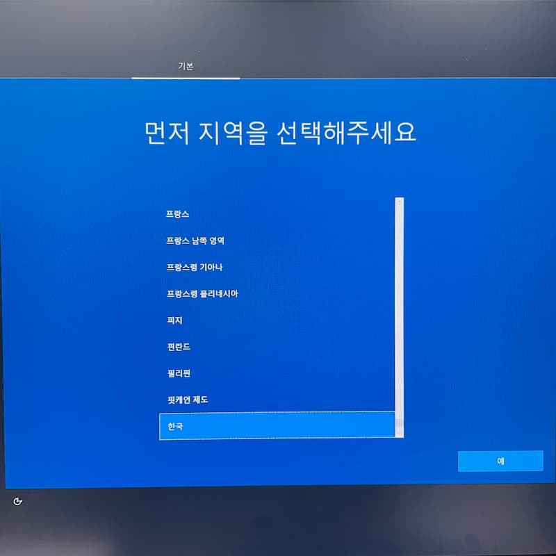 윈도우가 다시 시작되고 지역을 설정해줍니다. 저는 한국인이므로 한국을 골라주었습니다.